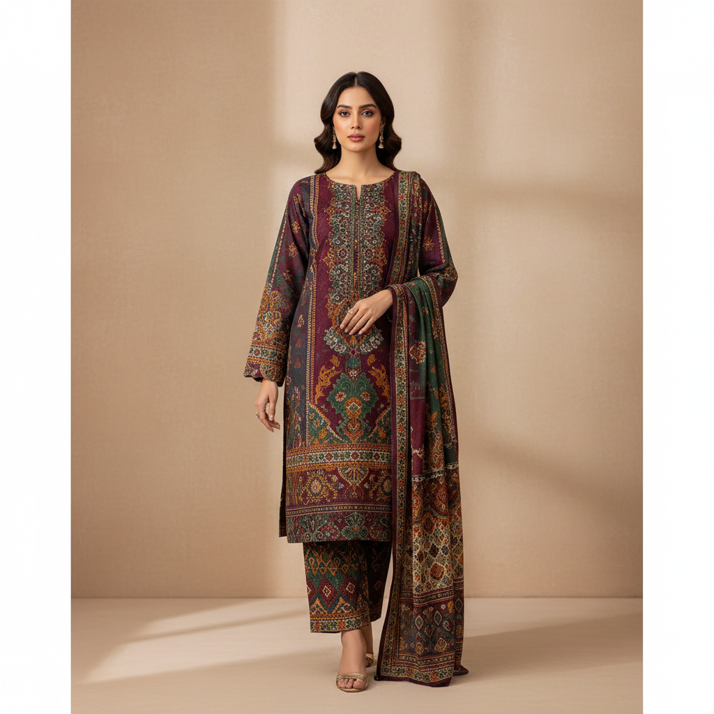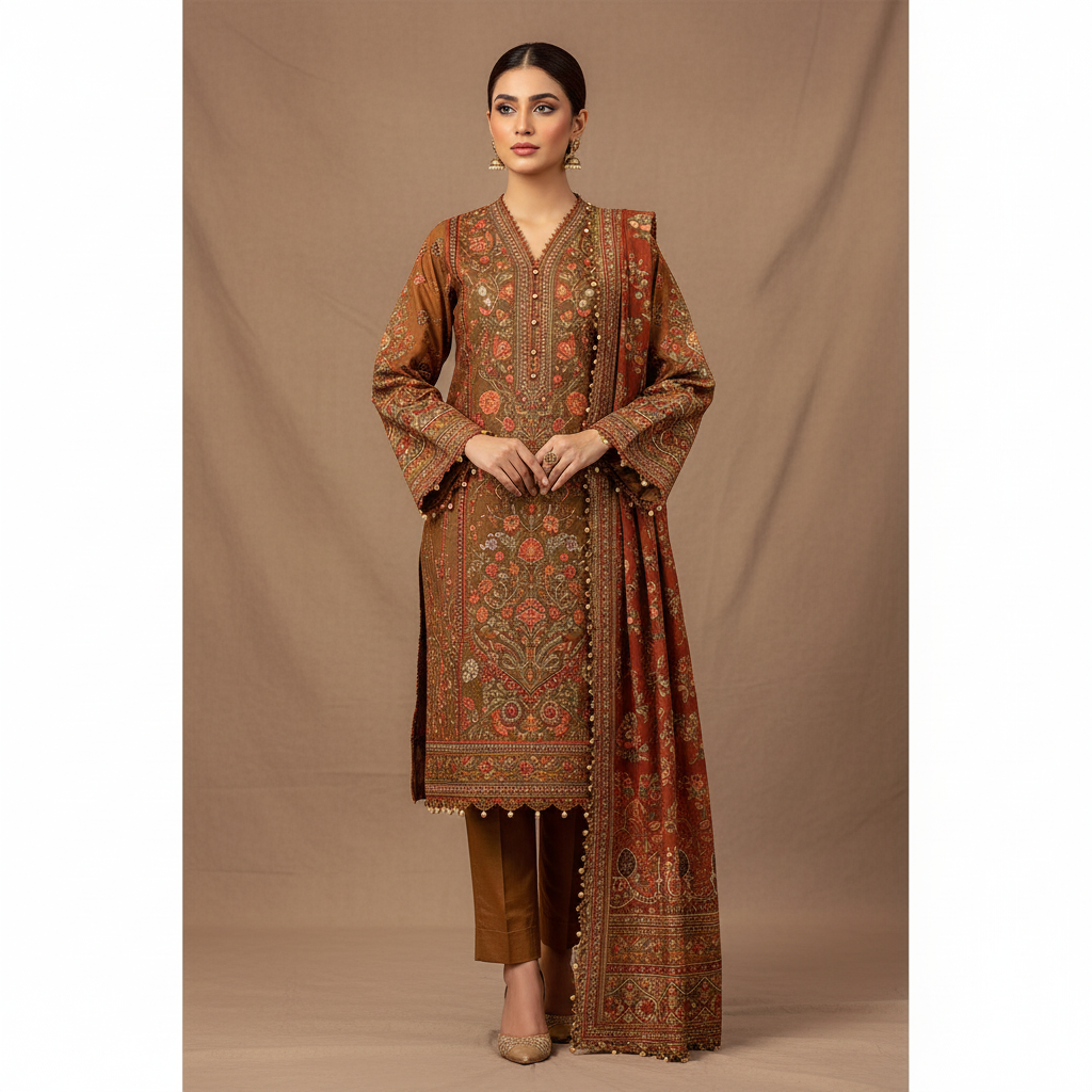 Shawls are the heart of traditional winter fashion. A good shawl not only adds warmth but also instantly elevates the simplest outfits. Wool, pashmina, and Kashmiri embroidered shawls are versatile, pairing effortlessly with khaddar, karandi, or linen suits. Available in a spectrum of colors — deep maroon, earthy brown, mustard, and soft beige — shawls can be draped in multiple ways: over one shoulder, wrapped fully around, or loosely layered. The texture, embroidery, or woven patterns bring out the rich cultural essence of Pakistani fashion.
