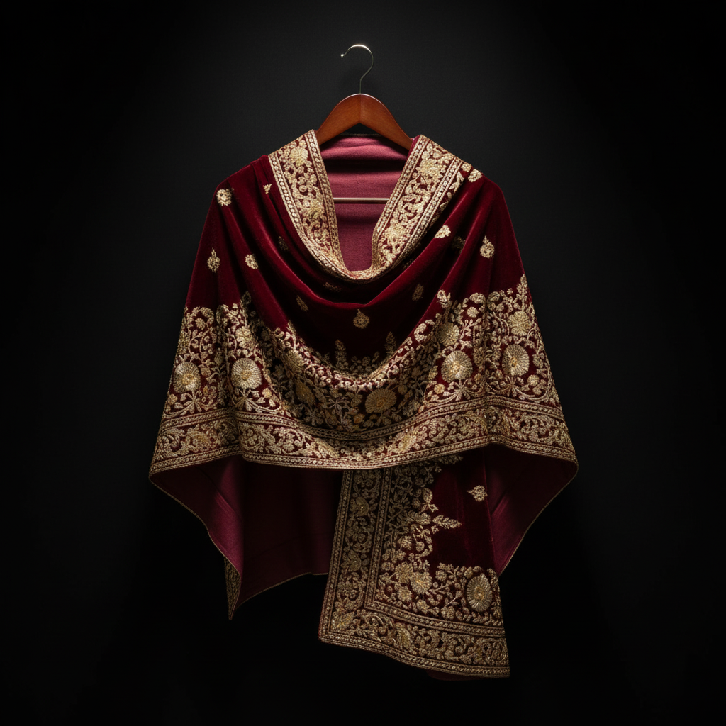 Velvet is the ultimate winter luxury. Velvet shawls are soft, rich, and instantly elevate any outfit. They come in solid deep shades or embroidered with gold or silver thread for an opulent look. Ideal for evening parties, weddings, or festive gatherings, velvet shawls provide warmth while maintaining a regal, sophisticated style.